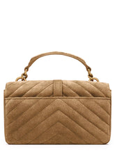 Saint Laurent Mini College bag is made from light brown suede leather and adorned with a signature YSL logo plaque.