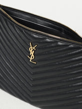 Saint Laurent Medium Cassandre Quilted Wristlet Pouch is crafted from black matelasse calfskin leather and adorned with a signature YSL logo plaque.